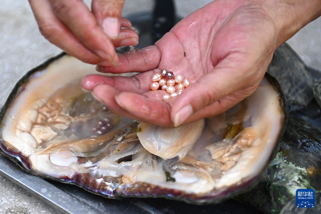 8月9日,工作人員在浙江省諸暨市山下湖鎮開蚌取珍珠。