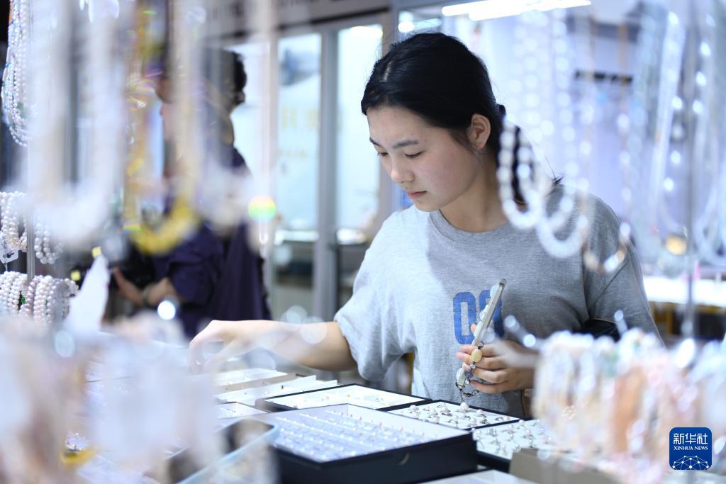 8月9日,一名顧客在浙江省諸暨市山下湖鎮的華東國際珠寶城選購珍珠飾品。