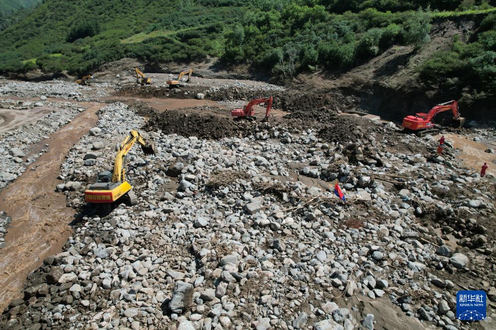 8月11日,在榆中縣馬坡鄉(xiāng)陽屲山村,中國安能救援隊(duì)使用挖掘機(jī)疏通清理山洪沖下的石頭(無人機(jī)照片)。