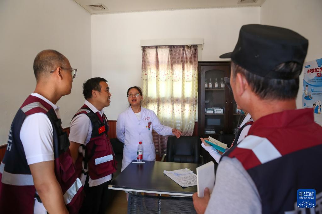 8月11日,在榆中縣馬坡鄉(xiāng)上莊村臨時(shí)安置點(diǎn)的醫(yī)療服務(wù)點(diǎn),疾控人員和醫(yī)護(hù)人員溝通環(huán)境消殺情況。