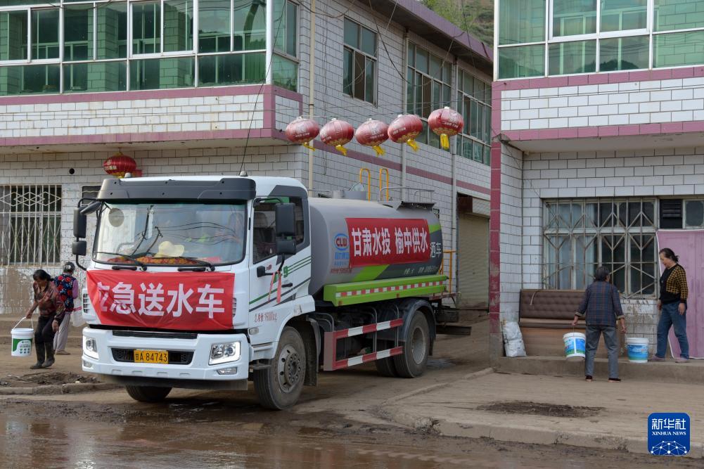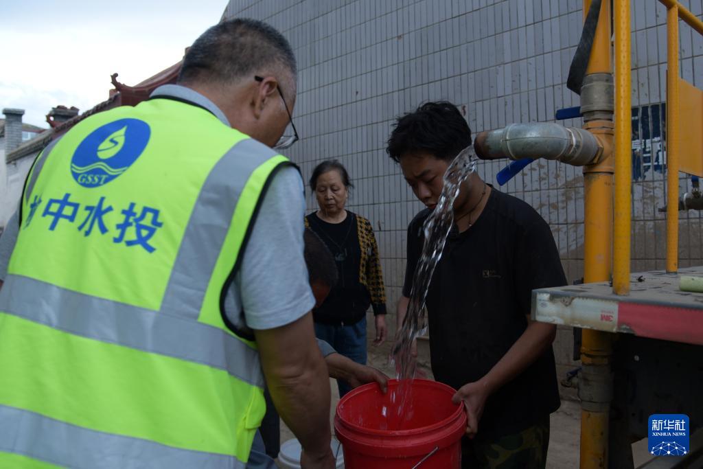 8月11日,在榆中縣城關(guān)鎮(zhèn)興隆山村,當(dāng)?shù)厮畡?wù)部門為村民送去飲用水。