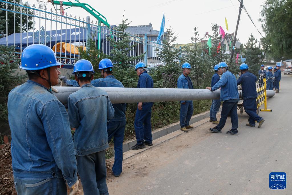 8月11日,在榆中縣馬坡鄉(xiāng)上莊村,電力人員進(jìn)行立桿架線作業(yè)。