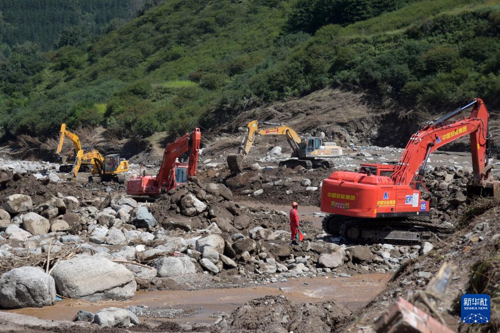 8月11日,在榆中縣馬坡鄉(xiāng)陽屲山村,中國安能救援隊(duì)使用挖掘機(jī)疏通清理山洪沖下的石頭。