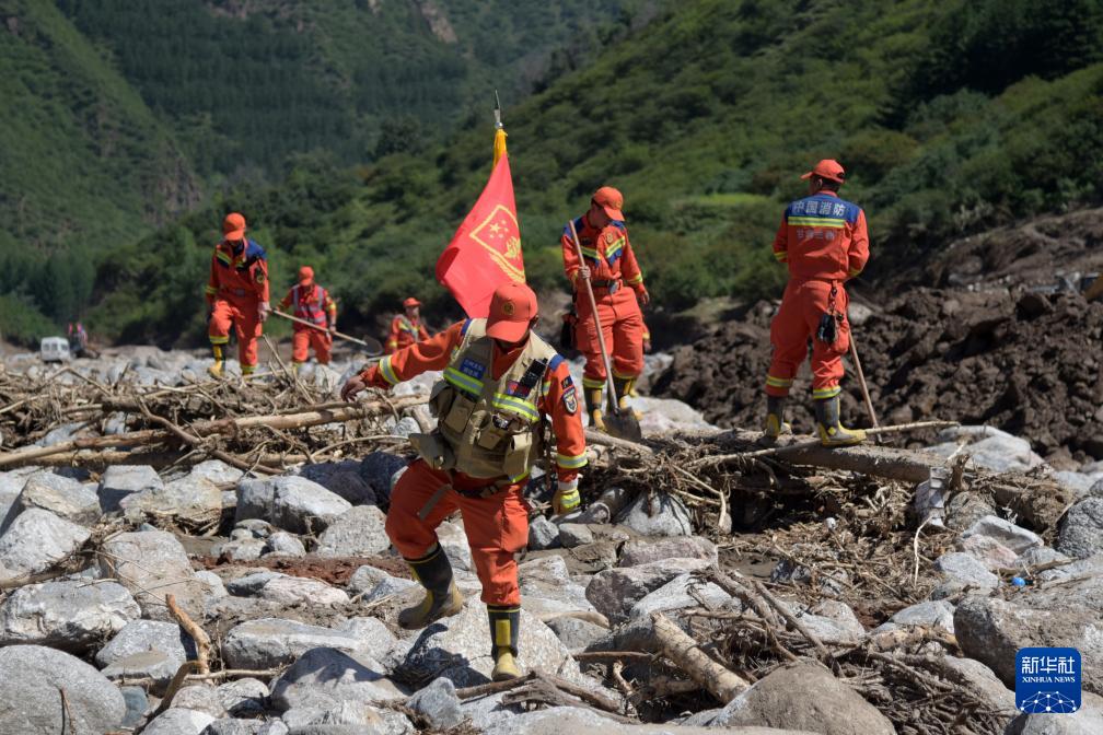 8月11日,在榆中縣馬坡鄉(xiāng)陽屲山村,蘭州市消防救援支隊(duì)救援人員開展清理搜尋工作。