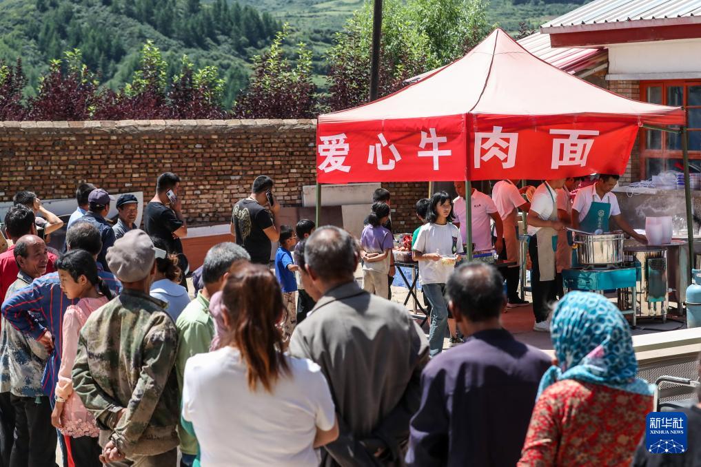 8月11日,在榆中縣馬坡鄉(xiāng)上莊村臨時(shí)安置點(diǎn),受災(zāi)群眾有序領(lǐng)取午餐。