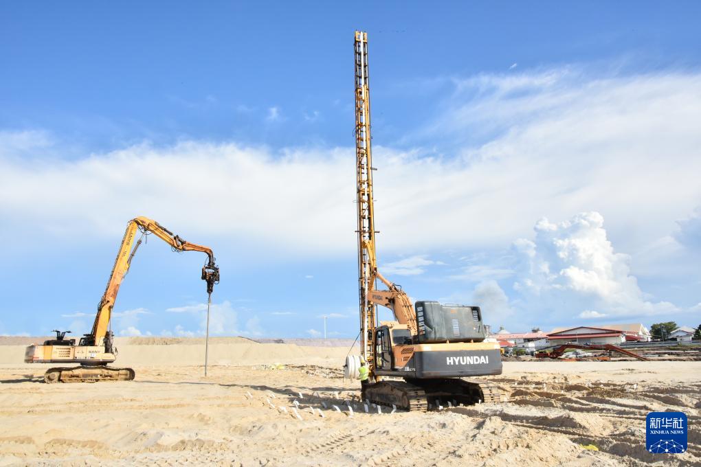 這是8月8日拍攝的文萊摩拉港集裝箱碼頭擴建施工現場。
