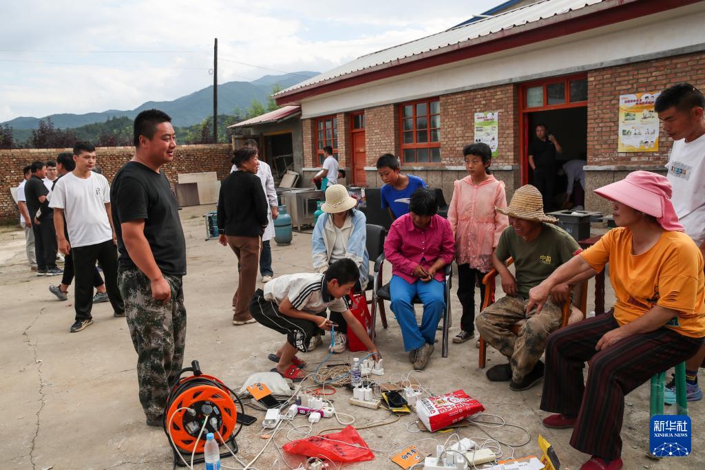 8月10日,在榆中縣馬坡鄉(xiāng)上莊村臨時(shí)安置點(diǎn),村黨支部書記陳萬(wàn)凱提醒受災(zāi)群眾,給手機(jī)充電時(shí)注意安全。