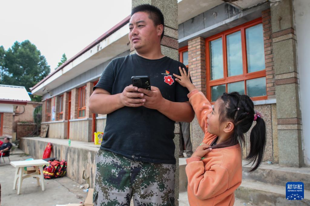 8月10日,在榆中縣馬坡鄉(xiāng)上莊村臨時(shí)安置點(diǎn),一個(gè)小女孩將一朵小紅花貼在陳萬(wàn)凱胸前。
