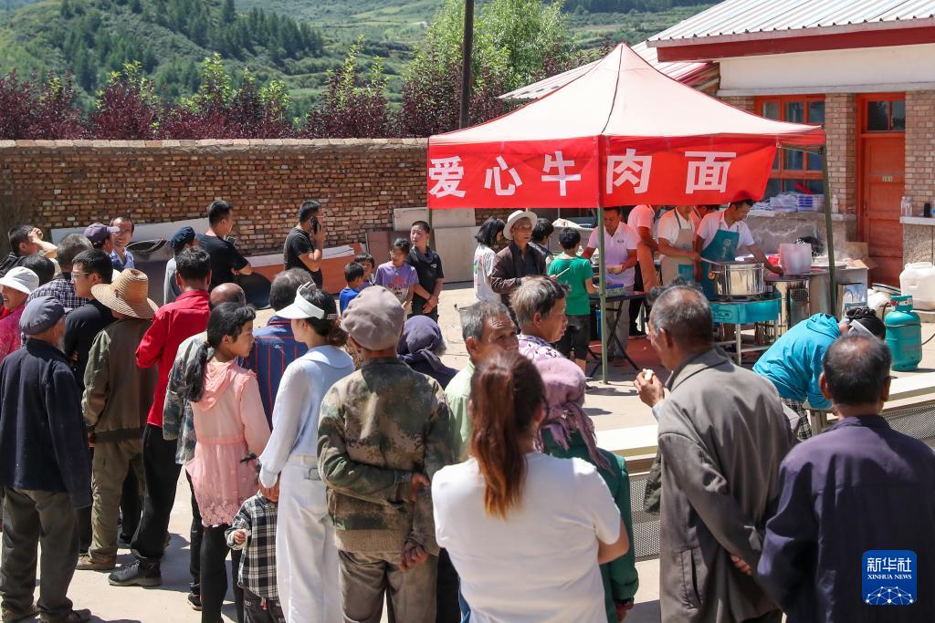 8月11日,在榆中縣馬坡鄉(xiāng)上莊村臨時(shí)安置點(diǎn),受災(zāi)群眾排隊(duì)領(lǐng)取愛(ài)心牛肉面。