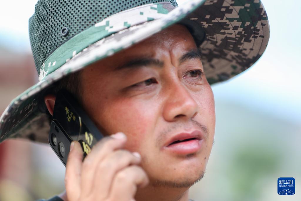 8月10日,在榆中縣馬坡鄉(xiāng)上莊村臨時(shí)安置點(diǎn),村黨支部書記陳萬(wàn)凱查看手機(jī)信息。