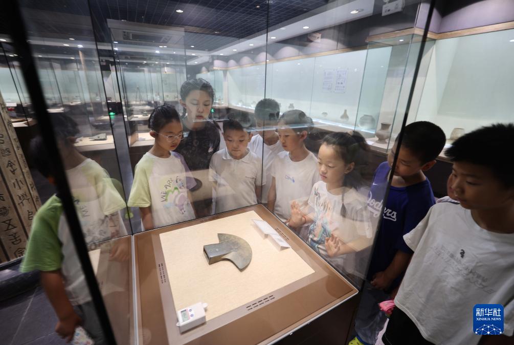 8月12日,在山東省臨沂市沂南縣博物館,小朋友們參觀館藏文物。