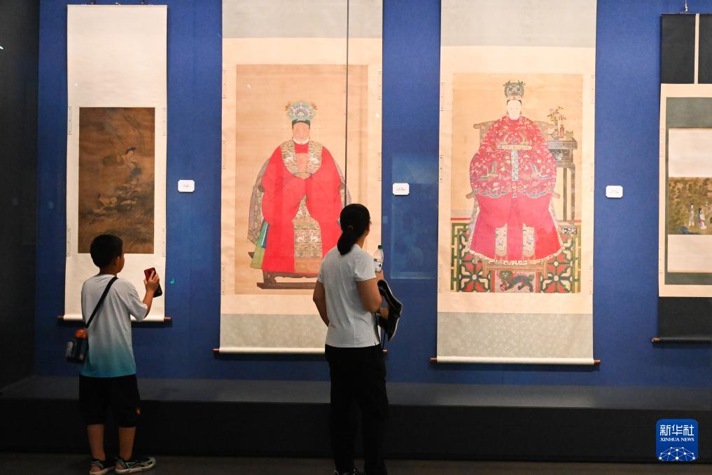 8月10日,家長帶領小朋友在山東省青州博物館觀看古代繪畫展。