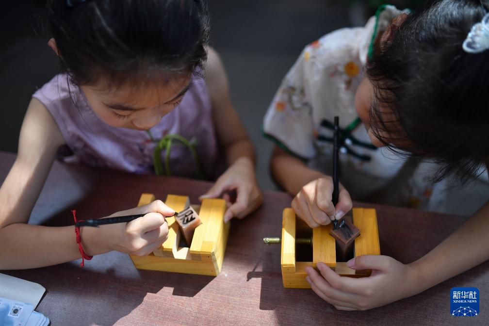 8月12日,在山東省青島市城陽區棘洪灘街道一家非遺工坊,學生在體驗篆刻。
