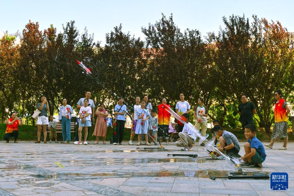 8月12日,小朋友在山東省煙臺市福山區銀河明珠社區暑期科普公益課堂上發射自制的“水火箭”。