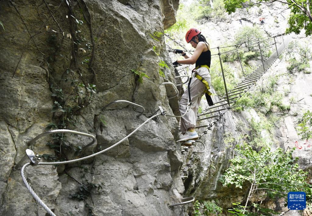 8月12日,在山東省棗莊市山亭區抱犢崮景區,一名小游客體驗“飛拉達”攀巖項目。