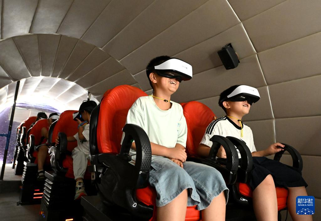 8月12日,在河北省石家莊市一家航天科技體驗館,小朋友在模擬太空艙內體驗。