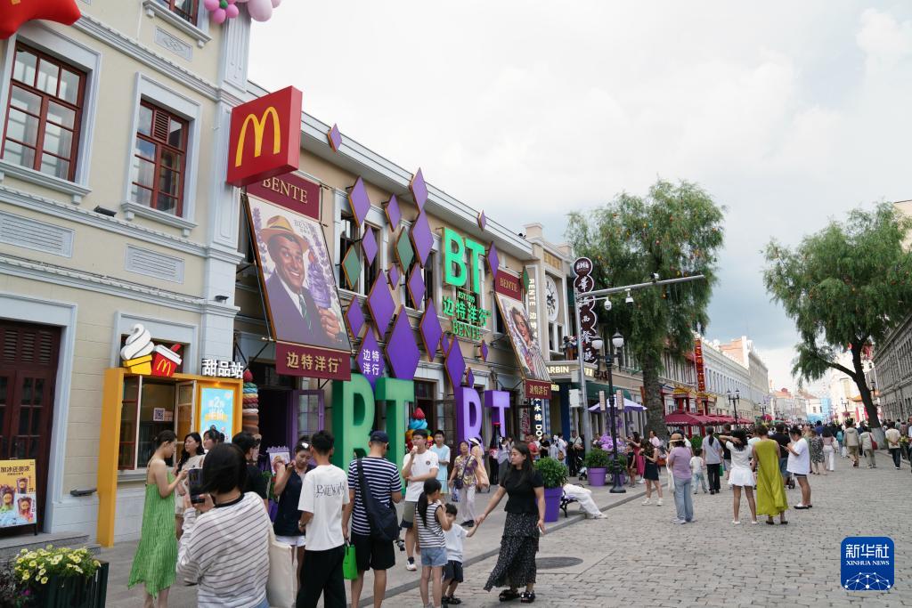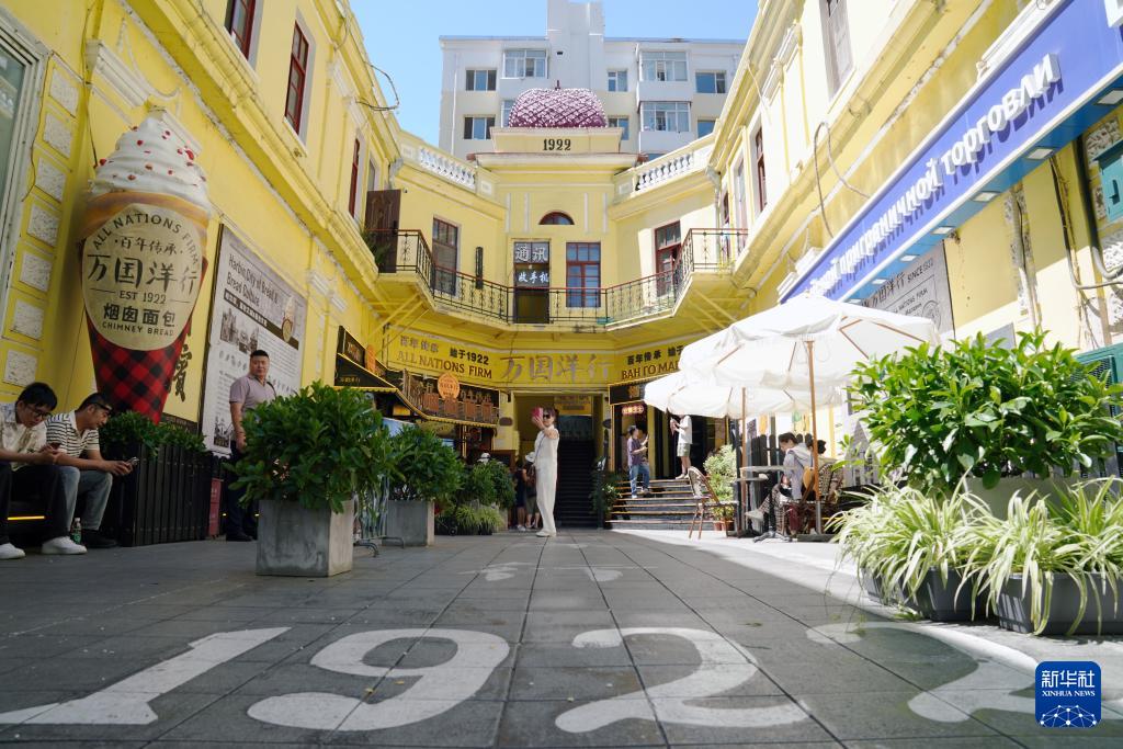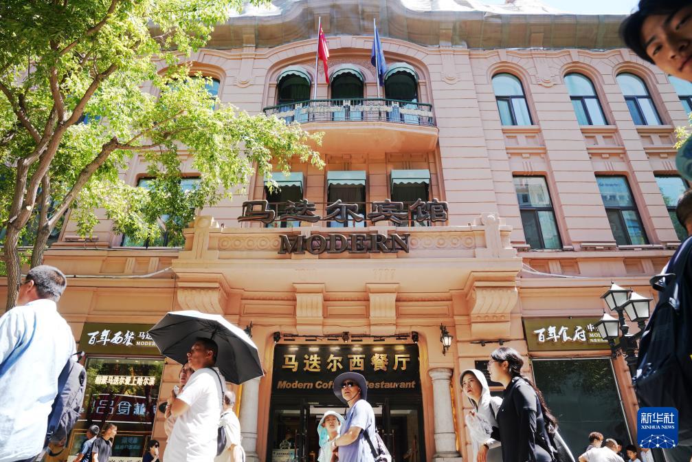 人們在哈爾濱中央大街萬國洋行前拍照“打卡”(7月30日攝)。