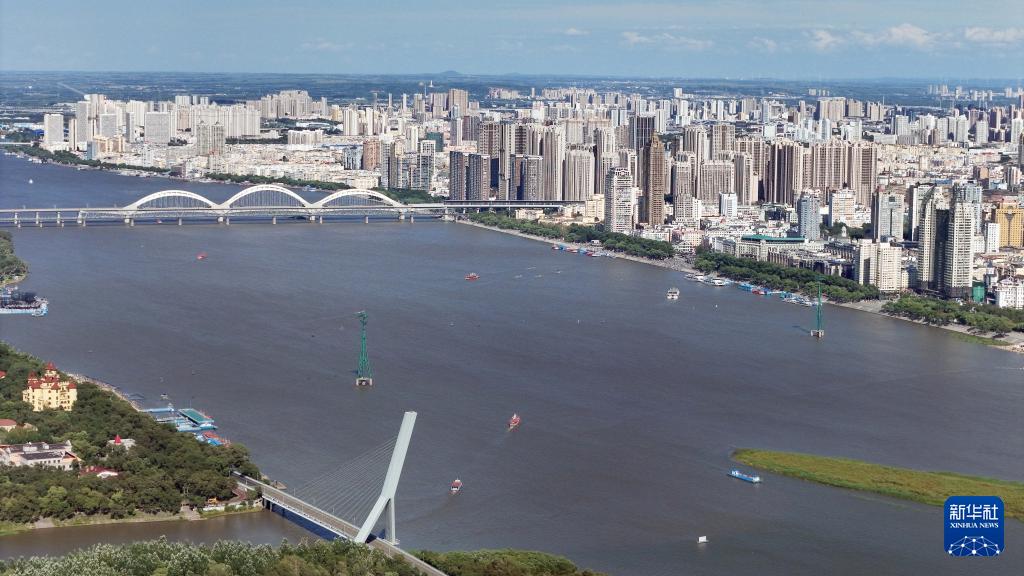 這是7月30日拍攝的松花江與沿岸的哈爾濱城市建筑(無人機照片)。