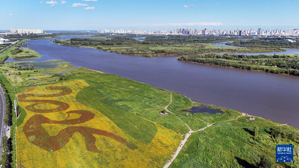 這是7月30日拍攝的哈爾濱濱水大道花海(無人機照片)。