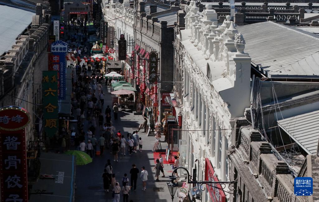 人們在哈爾濱中華巴洛克歷史文化街區游覽(8月5日攝)。