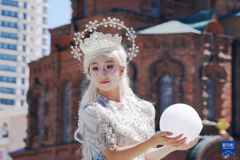 身穿公主服飾的游客在哈爾濱建筑藝術廣場進行攝影旅拍(7月30日攝)。