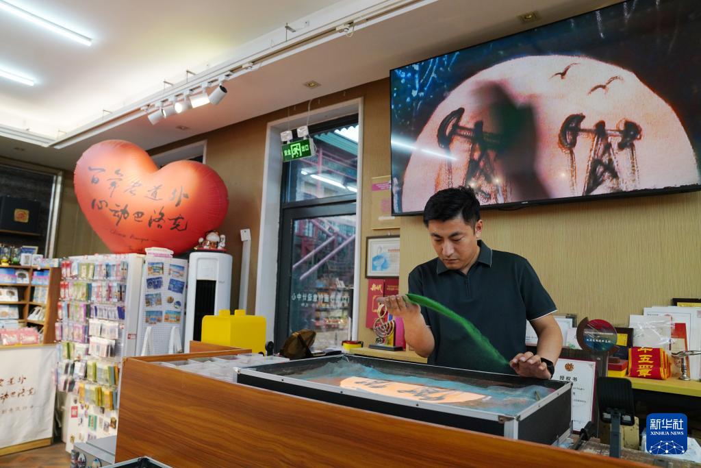 在哈爾濱中華巴洛克歷史文化街區一家沙畫創意設計中心,沙畫師薛以恒正在為顧客制作沙畫(8月5日攝)。