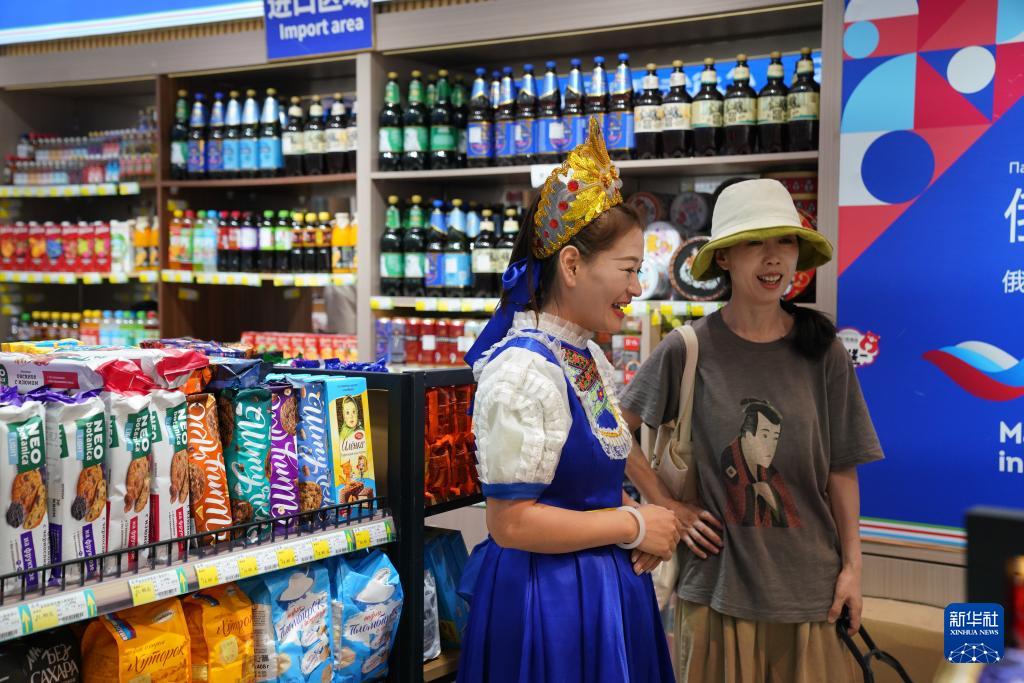 8月5日,游客在哈爾濱中央大街上的一家俄貨店挑選商品。