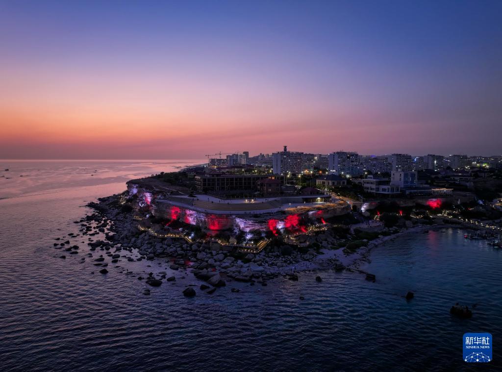 這是8月5日在哈薩克斯坦阿克套拍攝的傍晚時分的里海海濱風光(無人機照片)。