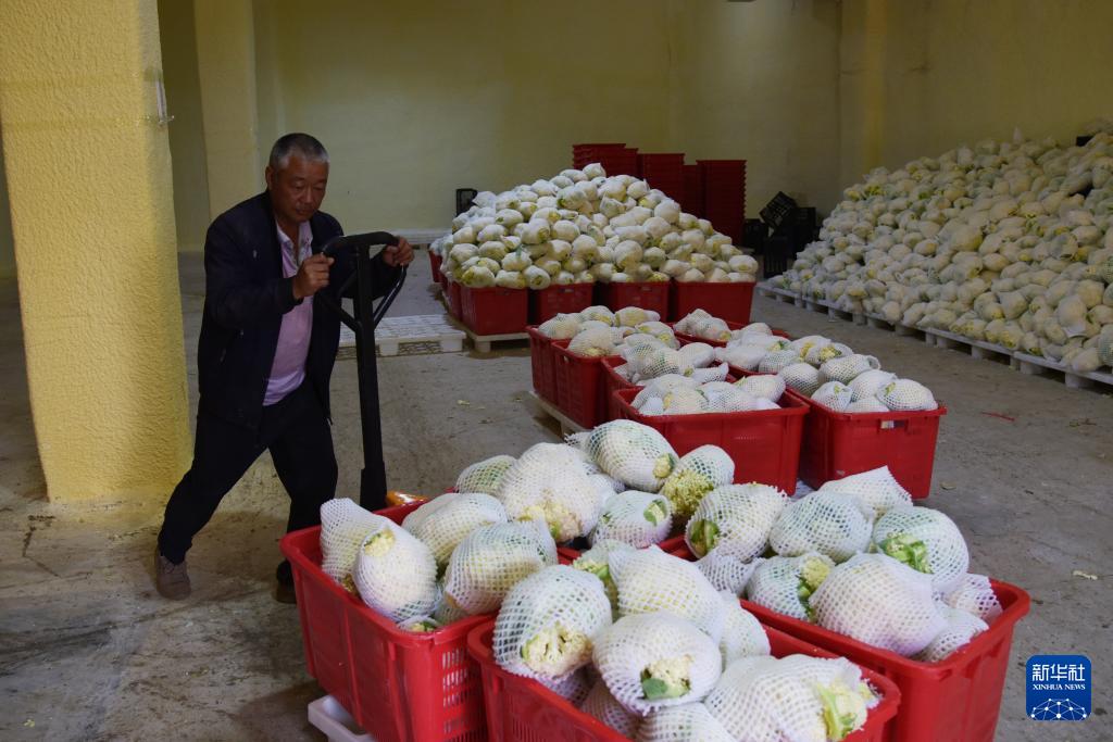 8月12日,在榆中縣馬坡鄉(xiāng)上莊村高原夏菜交易中心,村民在冷庫中轉(zhuǎn)運散花菜。