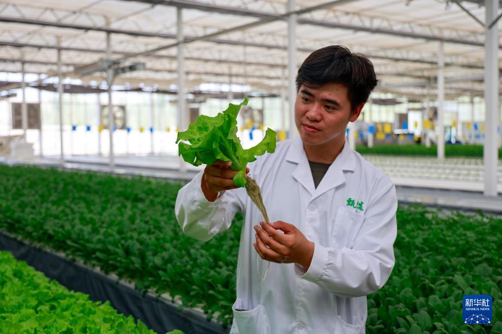 8月13日,在新疆阿克蘇地區庫車市甬庫同心村智慧農業植物工廠,來自寧波的援疆技術人員在查看生菜根部生長情況。