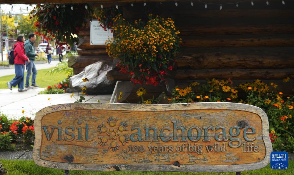這是8月14日在美國阿拉斯加州安克雷奇的游客中心門外拍攝的標(biāo)牌。
