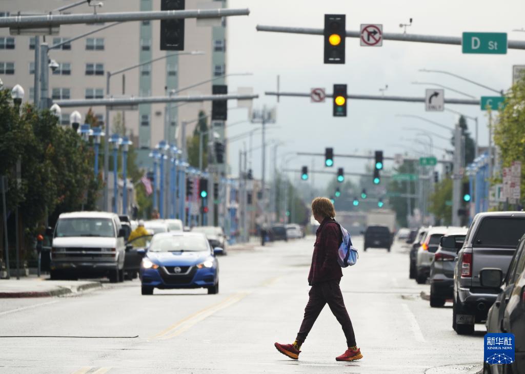 8月14日,行人從美國阿拉斯加州安克雷奇市中心街頭走過。