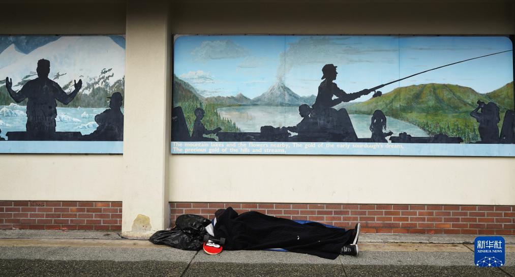 8月14日,在美國阿拉斯加州安克雷奇市中心,一名男子露宿街頭。
