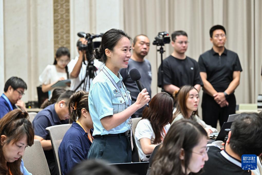 8月20日,國務院新聞辦公室在北京舉行新聞發布會,閱兵領導小組辦公室副主任、中央軍委聯合參謀部作戰局少將副局長吳澤棵,中國人民解放軍中部戰區閱兵指揮機構辦公室常務副主任、政治工作部少將副主任徐貴忠介紹閱兵準備工作有關情況,并答記者問。這是記者在現場提問。新華社記者 李鑫 攝