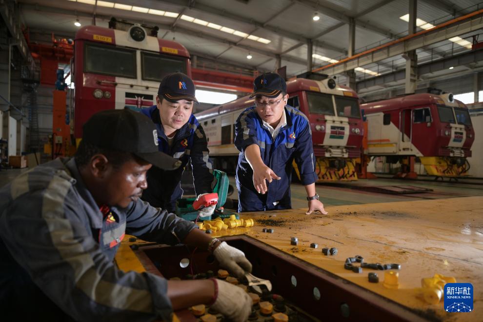 8月19日,在肯尼亞內(nèi)羅畢非洲之星鐵路運(yùn)營(yíng)有限責(zé)任公司機(jī)務(wù)檢修車間,中方工程師指導(dǎo)肯方工作人員檢修設(shè)備。