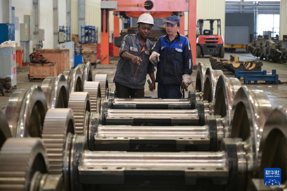 8月19日,在肯尼亞內(nèi)羅畢非洲之星鐵路運(yùn)營(yíng)有限責(zé)任公司機(jī)務(wù)檢修車間,中方工程師與肯方工作人員檢查即將組裝的機(jī)車輪對(duì)。