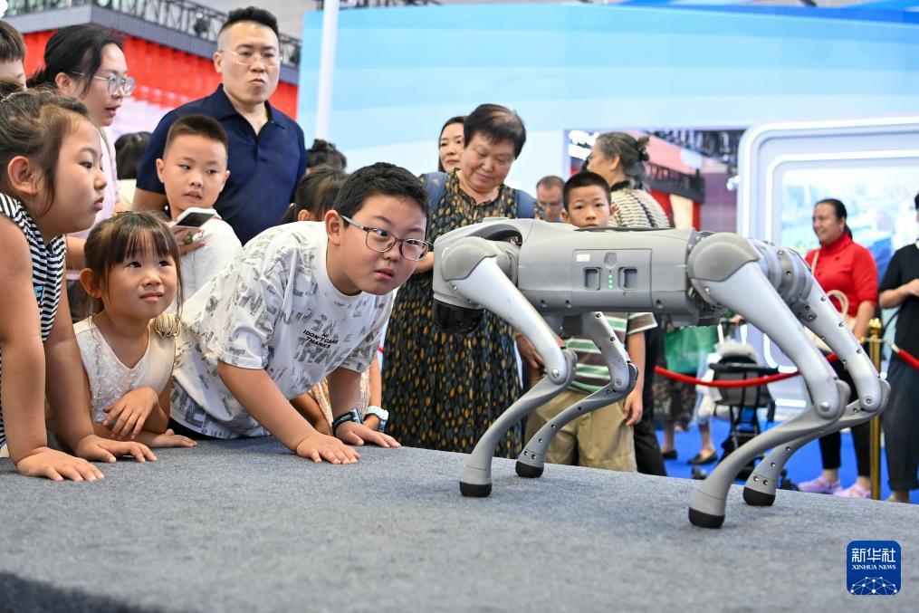 8月21日,小朋友們在第七屆山西文化產業博覽交易會上和機器狗互動。