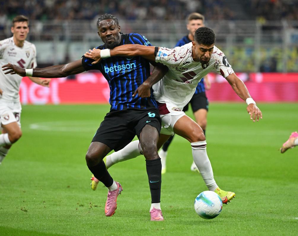 8月25日,都靈隊球員馬西納(右)與國際米蘭隊球員圖拉姆在比賽中拼搶。新華社發(阿爾貝托·林格利亞攝)