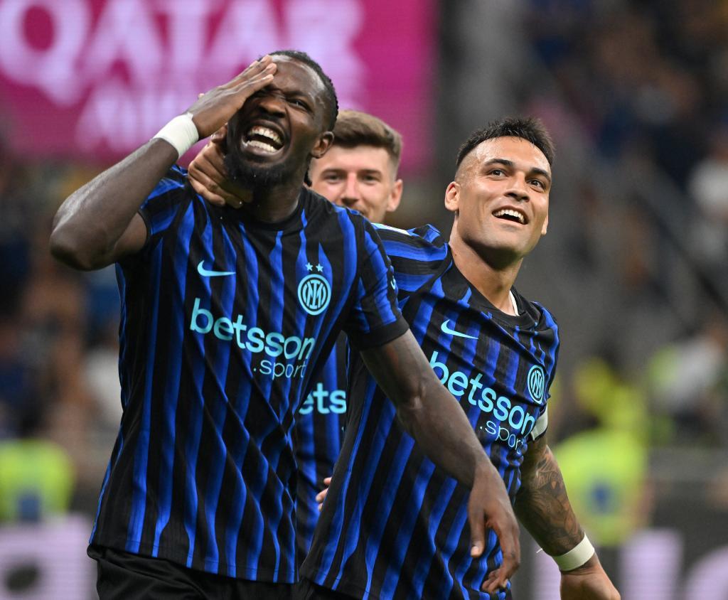 8月25日,國際米蘭隊球員圖拉姆(左)與隊友勞塔羅·馬丁內斯慶祝自己本場第二粒進球。 新華社發(阿爾貝托·林格利亞攝)