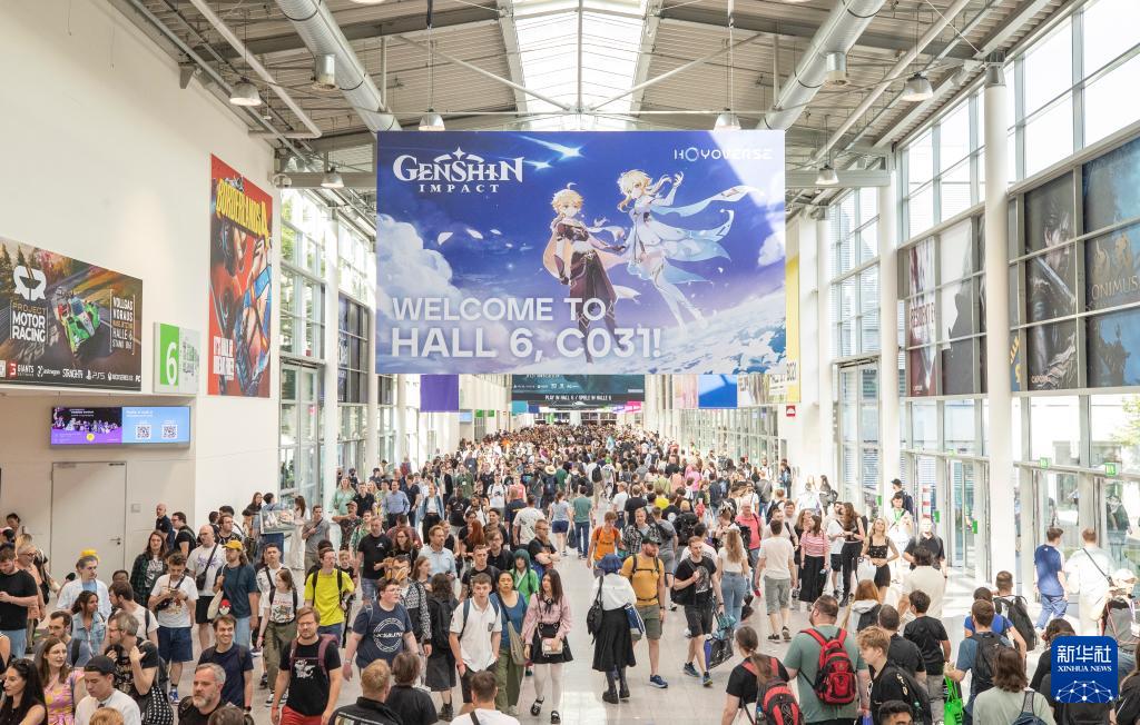 8月21日,在德國(guó)科隆,參觀者在科隆游戲展走過游戲《原神》海報(bào)。