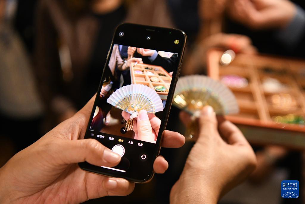 8月22日,在瑞士伯爾尼中國(guó)文化中心,嘉賓在 “安善萃錦——中式生活美學(xué)展”上拍攝精美飾品。