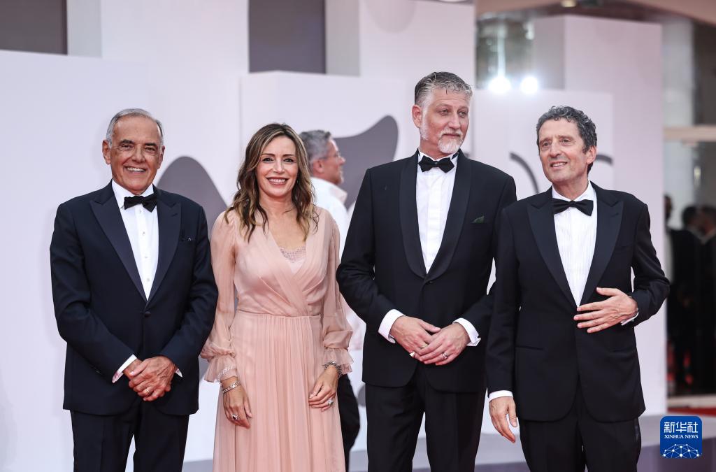 8月27日,在意大利威尼斯,2025威尼斯雙年展主席布塔福科(右一)、威尼斯電影節主席巴爾貝拉(左一)與意大利文化部長亞歷桑德羅·朱利(右二)出席紅毯儀式。