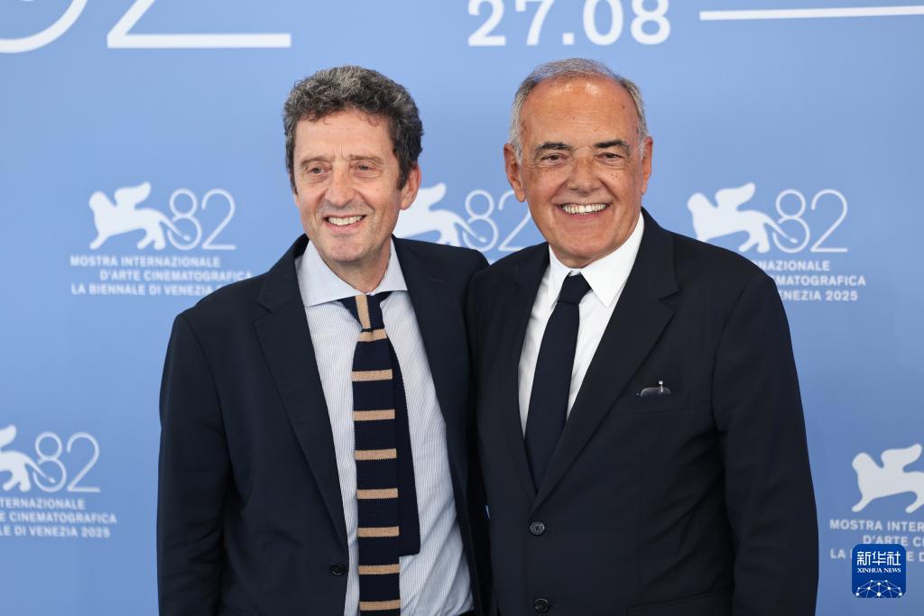 8月27日,在意大利威尼斯,2025威尼斯雙年展主席布塔福科(左)與威尼斯電影節主席巴爾貝拉在拍照式上。