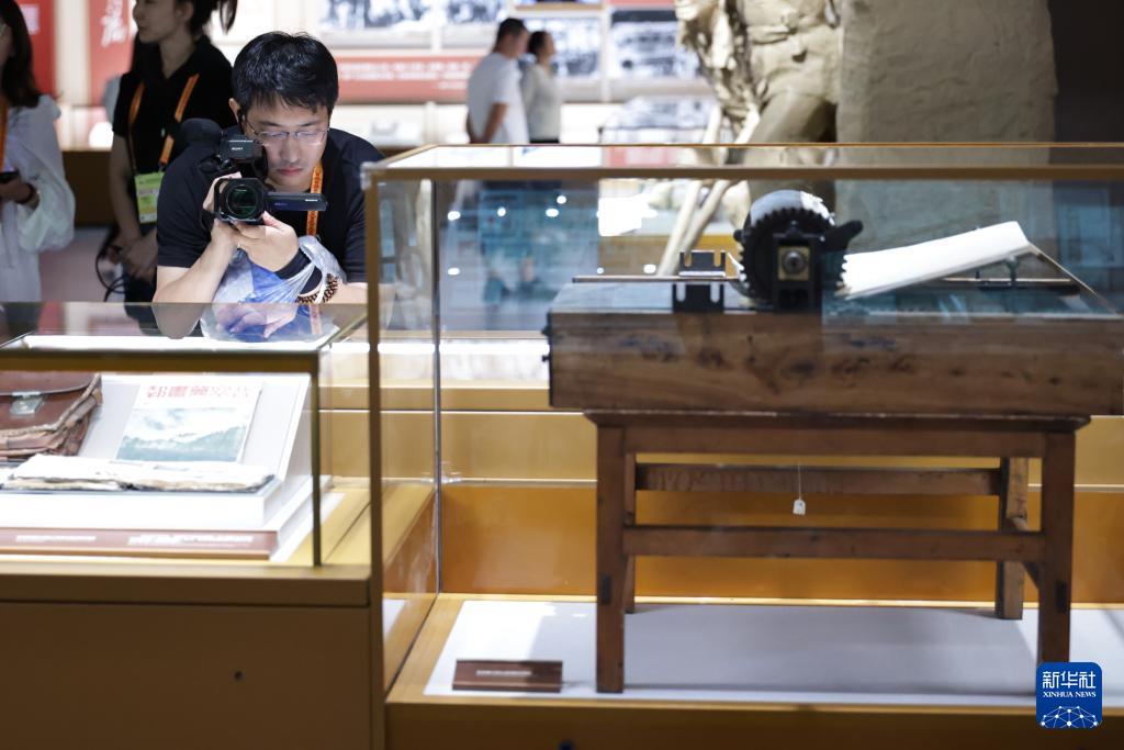 8月27日,中外媒體記者在中國人民抗日戰爭紀念館內采訪。