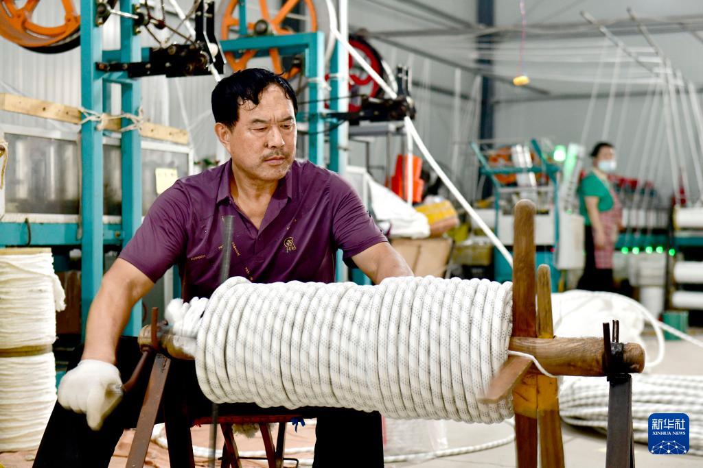 8月27日,在濱州市惠民縣李莊鎮一處“紅網工坊”,村民在加工安全繩。