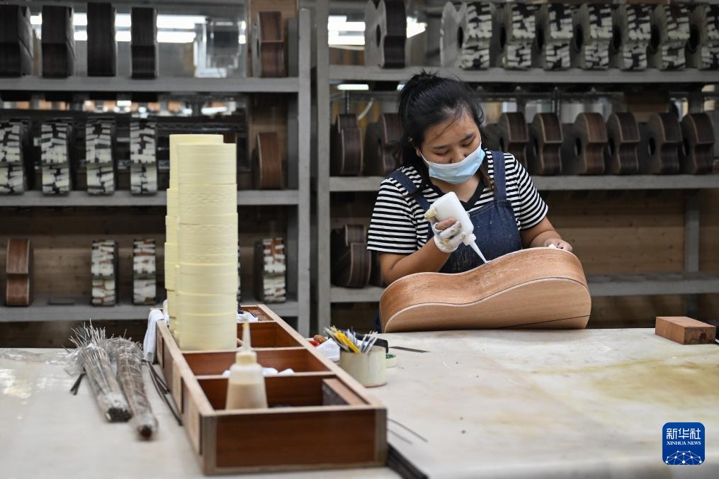 8月28日,在湖北省松滋市一家吉他企業(yè)生產(chǎn)車間,工人在制作吉他。