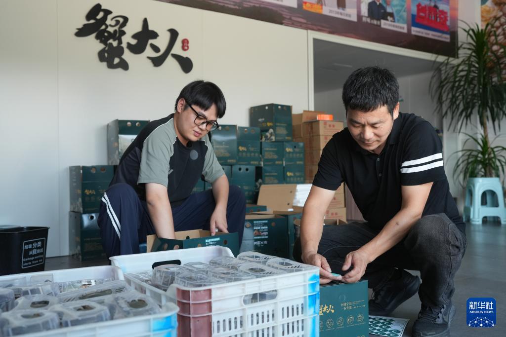 9月2日,在寧海的一家青蟹銷售網店,工作人員將青蟹裝箱快遞。