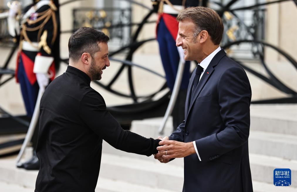 9月4日,在法國首都巴黎的總統(tǒng)府愛麗舍宮,法國總統(tǒng)馬克龍(右)迎接出席“志愿聯(lián)盟”線上會(huì)議的烏克蘭總統(tǒng)澤連斯基。新華社記者 高靜 攝