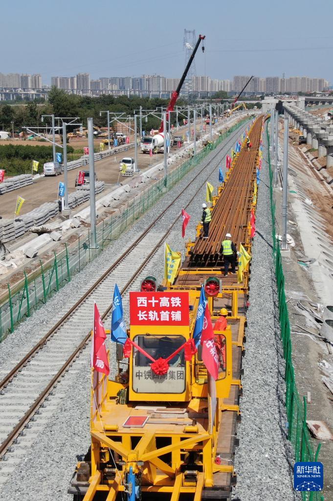 9月8日,在西十高鐵建設現場西安東至藍田作業區間,施工人員將首對500米長的無縫鋼軌平穩鋪設在無砟軌道板上,標志著由西成客專陜西公司建設、中鐵四局施工的西十高鐵全線鋪軌正式啟動。