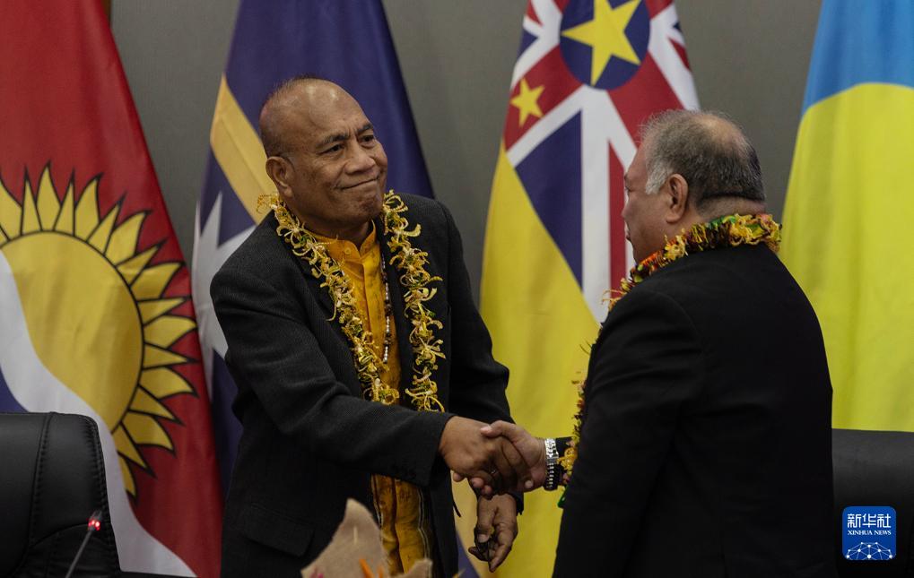 9月8日,在所羅門群島首都霍尼亞拉,基里巴斯總統塔內希·馬茂(左)與太平洋島國論壇秘書長巴倫·瓦卡握手。新華社記者 馬平 攝